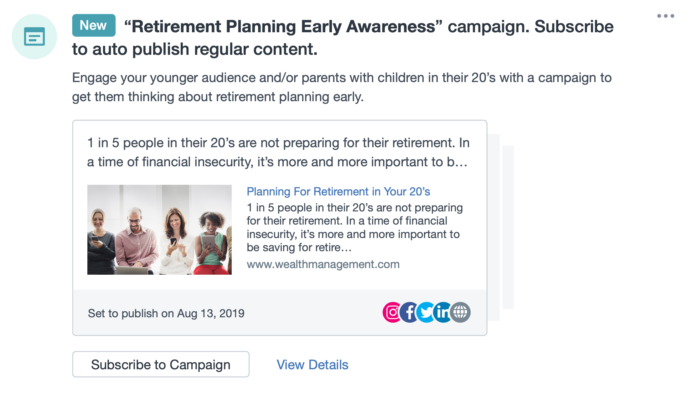 This card prompts advisors to create and publish a piece of original content. If an advisor hasn't posted original content in the previous two weeks, this Action Card will prompt the advisor to do so. When an advisor gets the Action Card and clicks on the Create New button, the Action Card brings up the Publisher. The advisor follows the same steps as always to create a new post.