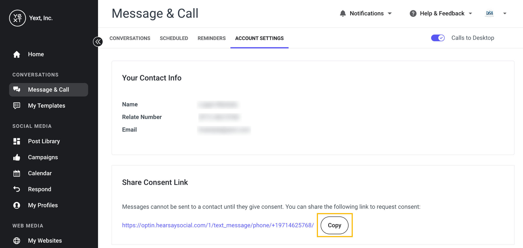 Le lien de consentement au partage se trouve dans la page Paramètres du compte de Relate. Ce lien permet à vos clients de s'inscrire de manière proactive pour recevoir des messages SMS de votre part. Cette fonction génère une URL unique pour votre numéro Hearsay Relate, permettant aux clients d'initier le processus de consentement sans que vous ayez à envoyer manuellement une demande.
